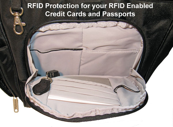In high-end travel bags, we apply metallic fabric to make these pockets for ID cards, wallet, and passport. So our bags are anti theft and RFID blocking/protection.